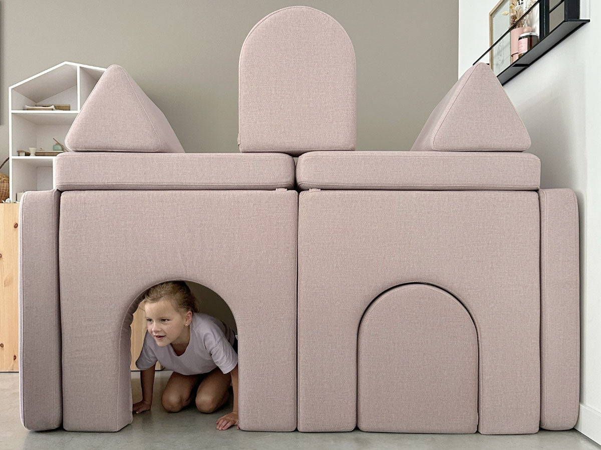 Space-efficient. After playtime, the modules return to sofa form or stack into a compact block. One product = furniture + toy + guest mattress (sleepover).