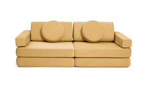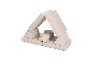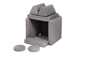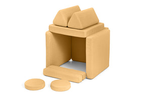 Shappy comes with two mattress-quality base cushions, two armrests, two round pillows, and triangular backrest pillows. The fabric's natural resilience keeps everything stable and comfy, whether you're playing or lounging.