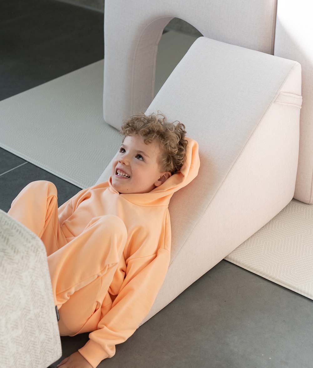 This slide fits perfectly with our play sofa, offering a safe 40 cm width ideal for toddlers. Made of soft foam, it ensures a secure and gentle sliding experience.