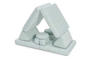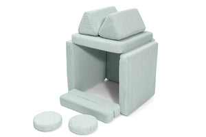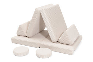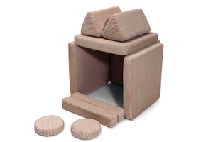 • El Shappy Play Sofa Pure Corduroy Mini incluye ocho piezas -cuatro cojines de asiento (dos cosidos cada uno), dos triángulos como respaldos, dos reposabrazos y dos cojines redondos- que proporcionan una estructura cómoda y de apoyo para que su hijo juegue.