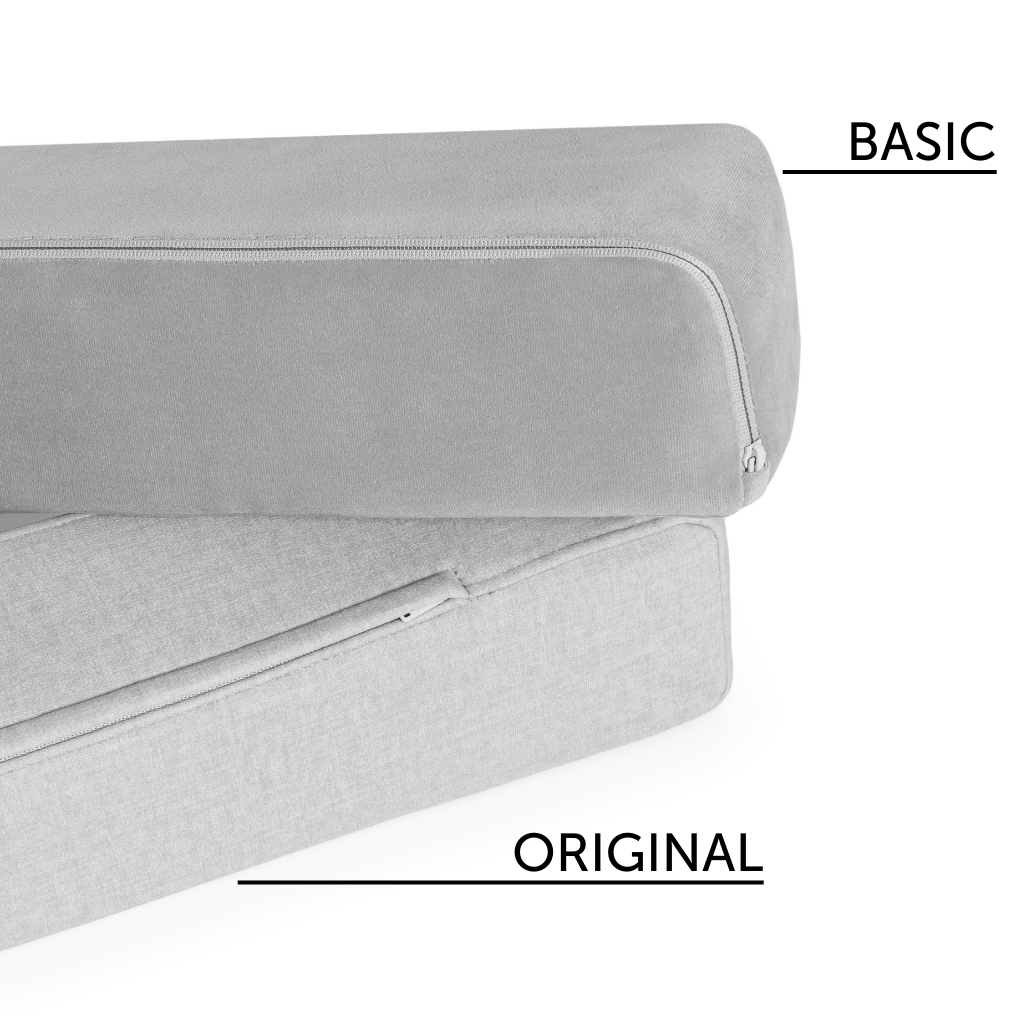 Ambos sofás tienen las mismas cremalleras de alta calidad que combinan con el color de la tela, aunque en el Sofá Shappy Play Original, los tiradores están ocultos en toda la pata de la cremallera, y en la versión Basic, los tiradores están ocultos en "garajes de cremalleras".
